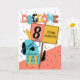 This is a fun and colourful employee 8 year anniversary card featuring a comical dog illustration. The dog is wearing huge glasses and has a sign with him on which is written: '8 YEARS ALREADY!', above which is the text: DOGGONE which is written in an illustrated, colourful font.
