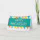 This is a colourful Employee Anniversary card, set against a white with small triangles pattern background. In the centre of the card is the text 'HAPPY ANNIVERSARY' set against a green jade background. In matching colours to the triangles pattern, there is bunting above and below the text.