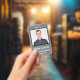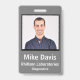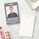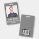 Classic Employee ID badge in traditional design. Stone Grey background. All elements are changeable or removable. Elements include: employee photo, employee name, company name, employee department. Back of design has security barcode scan. Slot at top for lanyard.