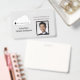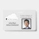 Horizontal Employee ID badge with light grey background and framed employee photo.All elements are changeable or removable. Front of Badge Elements include: company logo, company tagline,employee photo, employee name, employee department. Back of design has company info, "if found" instructions to return to company, and security barcode, all customisable. Also available in vertical orientation. Slot at top for lanyard. All of these elements can be changed or deleted.