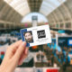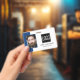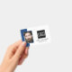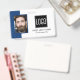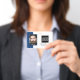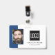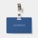 Smart business office ID badge featuring a blue and white background, a photo of the employee, your company logo, name and profession.