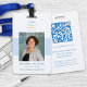 Maintain a clean, modern look for your team with these customisable vertical employee ID badge lanyard with security qr code, featuring a minimalist design with muted grey background with a soft blue strip and modern professional blue sans serif typography. Each badge can be personalised with an employee photo, name, and two additional lines of custom text—ideal for including an ID number, job title, department, or office location. Add your company logo at the top to create a unified, professional brand identity. The reverse side includes an optional custom text field, perfect for return instructions, emergency contact information, or any other important details. Designed for simplicity and functionality, these badges are ideal for businesses, schools, healthcare settings, events, and more—anywhere a polished and secure ID solution is needed. Original design by artist and designer Catherine Sweetman