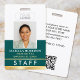 Create a professional appearance with this personalised staff identification badge. A simple and stylish template with your ID photo, name, job title, employee number, company logo, and scannable QR code. All the text can be customised or deleted to suit your business needs. This elegant design would suit many different workplaces and professions, including retail salespersons, restaurant and foodservice employees, office staff, small businesses, conference name tags and more! Printed colours: teal green and white with a gold gradient.