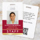 Create a professional appearance with this personalised staff identification badge. A simple and stylish template with your ID photo, name, job title, employee number, company logo, and scannable QR code. All the text can be customised or deleted to suit your business needs. This elegant design would suit many different workplaces and professions, including retail salespersons, restaurant and foodservice employees, office staff, small businesses, conference name tags and more! Printed colours: deep red and white with a gold gradient.