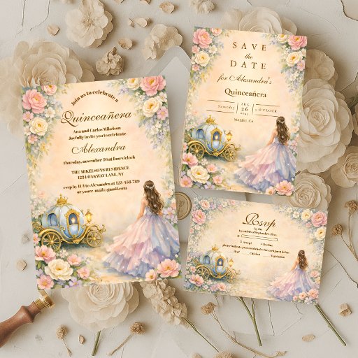 A dreamy fairytale quinceañera design inspired by storybook romance and soft garden elegance. Delicate florals, a flowing gown, and vintage European details create a magical atmosphere perfect for a once-in-a-lifetime celebration. Designed to feel timeless, romantic, and graceful, with a refined palette and elegant layout that highlights personalization beautifully.