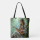A mystical ethereal monogrammed tote bag featuring an elven girl in vintage dress sitting under a tree with playing her ukulele in an enchanted forest.