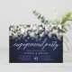 Our elegant engagement party invitations in chic navy blue, gold and white feature a top border of champagne-hued bokeh lights, with "engagement party" in chic calligraphy script typography. Personalise with your engagement celebration details beneath in white. A chic design in classic navyand white for modern couples and elegant events.