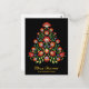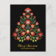 The front of the postcard features a stunning holiday scene. Against a deep, velvety black background, a majestic Christmas tree takes centre stage. The tree is not composed of traditional evergreen branches, but rather a vibrant array of meticulously crafted folklore-inspired flowers. These flowers, in shades of rich red, dark yellow, delicate lavender, soft peach, and muted slate blue, interlace seamlessly to form the shape of the tree.
