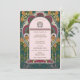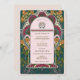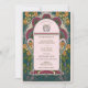 This invitation is a masterpiece that intertwines the mystical allure of an enchanted forest with the geometric elegance of Art Deco design. Rich emerald green forms a lush backdrop for the intricate faux gold detailing. Romantic blooms in shades of blush pink and marigold create a sense of warmth and whimsy. The contrast of the soft pink central panel with the surrounding vibrant foliage and florals invites guests into a wedding celebration that promises to be a luxurious fusion of nature and artistry. It's a perfect choice for couples looking to dazzle their guests with the romance and sophistication of a bygone era reimagined for modern nuptials.