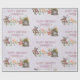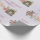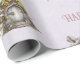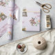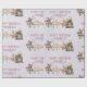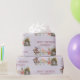 This magical and whimsical gift wrapping paper features an enchanted forest theme. An image of a fairy door in a little mushroom garden is placed at the bottom, with a fairy fluttering above it. Various flowers and mushrooms are placed along the bottom. The background is a faded purple pattern. A sample name and Happy Birthday greeting are printed above the fairy garden, which you can personalise to include your own custom name or text.