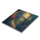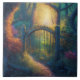Beautiful decorative tile features an AI generated digital art image of a magical forest garden gate with sun ray beaming in background.