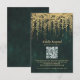 A whimsical illustration of lush hanging vines layered with gold (digital effect, not real foil!) over a sparkling emerald green watercolor background, sparkling with fairy lights and magic dust, decorates this winter spring summer fall wedding QR RSVP card with an enchanted forest theme. An elegant, modern reply card for a fairytale wedding. Perfect for brides who love the fairytale forest setting, the fairy forest or fairy garden theme and emerald green, mauve and gold.