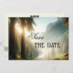 A dreamy Save the Date card featuring a painting of an enchanted forest in the mountains. The QR code template on the back can be easily customised by adding your own website URL.