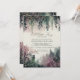 A whimsical watercolor illustration of lush foliage in emerald green and mauve and purple, sparkling bright with fairy lights and magic dust, with the mountains in the background and an adorable little fairy hidden in the greenery, decorates this girl baby shower invitation with an enchanted forest theme. An elegant, modern invitation for a fairytale baby shower. Perfect for moms to be who love the fairytale forest setting, the fairy forest or fairy garden theme and emerald green, mauve and gold.