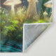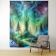 This magical fantasy design features a glowing forest illuminated by bioluminescent mushrooms and a starlit sky swirling with cosmic colours. A winding path glimmers in shades of turquoise and green, leading through tall pines towards a radiant tree at the centre. The mix of celestial light, vibrant hues, and dreamy atmosphere creates a surreal and otherworldly woodland scene.