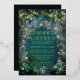 A whimsical watercolor illustration of lush foliage in emerald green and mauve and purple, sparkling bright with fairy lights and magic dust, decorates this spring summer fall Sweet 16 invitation with an enchanted forest theme that also features a frame of delicate roses in pink, purple and mauve. The text, as well as the lights, were produced with real gold foil. An elegant, modern invitation for a fairytale sixteenth birthday. Perfect for girls and families who love the fairytale forest setting, the fairy forest or fairy garden theme and emerald green, mauve and gold.