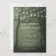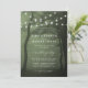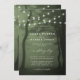 Rustic woodland dark green forest and white hanging twinkle lights modern typography script wedding invitation.