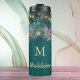 A whimsical watercolor illustration of lush emerald green foliage, accented with pink, fuchsia, mauve, and purple hues, sparkles with fairy lights and a touch of magic dust. This enchanting personalised monogram water bottle features an enchanted forest theme with a delicate frame of roses in pink, purple, and mauve and a classy monogram, as well as a template for the name in pretty calligraphy. This elegant and modern custom water bottle is perfect for a fairytale birthday, bridal shower, baby shower or wedding, a Christmas gift for mum, grandma or your best friend, or a birthday gift, ideal for those who adore a magical forest setting, fairy garden themes, or the timeless beauty of emerald green, mauve, and gold.