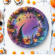 This vibrant Halloween-themed illustration features a central scene with carved pumpkins displaying various expressions, a witch’s hat, and ghosts. Surrounding this are more pumpkins, autumn leaves, spiders, spider webs, and bats against a backdrop that transitions from purple to orange, suggesting a sunset or twilight setting. Perfect for adding a touch of Halloween magic to any setting, these paper plates are ideal for parties and celebrations.