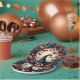 This vibrant and colourful illustration captures the essence of Halloween. It features a large grinning pumpkin wearing a witch’s hat, surrounded by playful ghosts, bats, smaller pumpkins, autumn leaves, and berries. The rich palette of purples, oranges, blues, and greens creates a lively yet spooky atmosphere, perfect for Halloween decorations or themed products. Additionally, this design is also available on paper plates, making it ideal for festive gatherings and parties.
