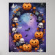 This captivating poster features a festive Halloween wreath adorned with smiling jack-o’-lanterns, eerie white skulls, mysterious purple flowers, and nocturnal black bats set against a hauntingly misty backdrop. Perfect for adding a touch of seasonal charm to any space