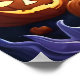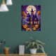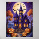 Step into a whimsical Halloween world with this enchanting illustration. Featuring a haunted house with crooked roofs and eerie bat silhouettes against a glowing full moon, this artwork captures the essence of Halloween. The scene is set with bare trees adorned with orange leaves and four carved pumpkins with glowing faces, creating a spooky yet charming ambiance. The gradient sky, transitioning from purple to orange, enhances the festive atmosphere, making this poster a perfect addition to your seasonal decor.