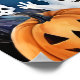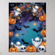 Capture the magic and mystery of Halloween with this enchanting illustration. Featuring a delightful array of carved pumpkins, friendly and spooky ghosts, and a garland adorned with autumn leaves, skulls, and flowers, this artwork brings the festive spirit of Halloween to life. The deep blue night sky, dotted with stars and flying bats, sets a perfect backdrop for this whimsical scene. Ideal for adding a touch of Halloween charm to any space, this poster is a must-have for the season