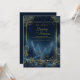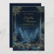 Step into a magical winter wonderland with this breathtaking starlit forest design. The scene is set against a deep, velvety midnight blue sky speckled with distant stars. Majestic pine trees, dusted in white frost, create a serene woodland backdrop, while warm golden glowing lights sparkle through the branches like captured stardust. A crisp, minimalist gold frame borders the landscape, adding a touch of sophisticated luxury to the dreamy and atmospheric vibe. The rich contrast between the cool navy tones and the warm golden bokeh creates a sense of romantic mystery and quiet majesty. This is a wedding invitation designed for formal winter ceremonies, enchanted forest celebrations, or starlit evening receptions.