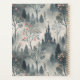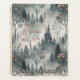 This fantastical scene planner features a dark, towering castle with glowing windows nestled in a misty forest of blue and grey tones. Surrounded by slender evergreens, bare-branched trees, and soft blossoms in pink and orange, the landscape shimmers with subtle specks of magical light. The twilight ambiance and ethereal details create a whimsical, mysterious atmosphere, perfect for lovers of fantasy, fairytales, and dreamlike forest settings.
