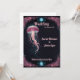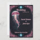 This enchanting wedding invitation design features an ethereal underwater theme. The focal point is a luminous pink and translucent jellyfish gracefully floating against a deep, dark background, evoking a mystical and serene ambiance. Intricate, coral-like decorative flourishes in soft pink and teal frame the edges, lending a sense of elegance and whimsy. At the top and bottom, ornate circular motifs resembling glowing orbs add a touch of celestial charm, complementing the oceanic palette. The overall design conveys a dreamy, otherworldly vibe, perfect for a romantic and unique wedding celebration.