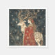 The artwork depicts an enchanting scene featuring a woman dressed in an ornate, crimson cloak adorned with golden patterns. Her long brown hair is elegantly styled, with floral and ribbon accents. She is gently touching a deer with intricate, branching antlers, decorated with ornaments. Snowflakes and starry patterns surround them, evoking a magical, wintery atmosphere. The artwork blends a mystical, fairytale-like charm with a holiday season ambiance, featuring a delicate, illustrative style.