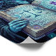 This fantasy poster features an enchanted witch with raven and glowing spellbook, mystical blue forest art, magical runes, crystal sigil, and fantasy gothic vibes. Finished in a oil acrylic painterly style.