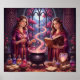 This whimsical poster features twin sorceresses brew a luminous potion amid stained glass and enchanted roses, surrounded by potions, grimoires and glowing symbols in a fantasy scene.