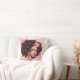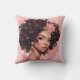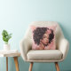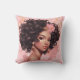 This throw pillow boasts a charming portrait of a black woman, her hair adorned with flowers, set against a soft pink backdrop. It's a celebration of beauty and elegance that will enhance any room.