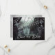 This Save the Date wedding announcement features an enchanting gothic graveyard scene in shades of grey. The old gravestones are scattered about with string lights hanging from haunting trees.