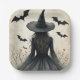 These paper plates are a delightful blend of whimsy and charm, perfect for celebrating the spooky season. These paper plates feature an enchanting image of a witch, complete with a pointed hat and flowing dress, standing against a backdrop reminiscent of aged parchment. Above the witch, a group of bats takes flight, adding to the Halloween ambiance. Perfect for those who enjoy traditional Halloween motifs with a touch of elegance and whimsy, these plates are a fun addition to your Halloween theme parties or decor. Their playful yet sophisticated style will be enjoyed by those who love to celebrate Halloween with style and charm.