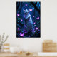 A fluffy tabby kitten sits in a magical forest at night, surrounded by many glowing purple butterflies, with soft light emanating from them. Clear details and vibrant colours enhance visual appeal.