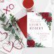 Celebrate your love in the enchanting embrace of the holidays with watercolor roses, ivy leaves, and holly berries adorning two corners of this beautiful design. The rich red and forest green colour scheme, complemented by pure white accents, evokes the spirit of the season and sets the stage for a romantic winter celebration.