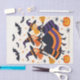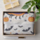 A festive trio of smiling witches takes flight on their brooms, soaring against a starry, bat-filled night sky. Dressed in vibrant orange and purple, they create a truly enchanting scene. Grinning jack-o'-lanterns and playful spiders complete this whimsical design, perfect for wrapping up all your Halloween treats.