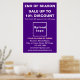 Poster that you can use as marketing material for your business to attract more customers every end of season. Customisable poster with end of season sale, your business name and other information. Customise it and use it to convince more customers to buy your products or clients to like your services this end of season. Design colours and shape are pink and white texts on purple background and portrait format rectangle shape. Contents are end of season, sale, percent discount that you will offer, sale dates, your business name, logo, address, phone number, e-mail and website or your social media page. Please check the appearance after uploading logo and typing texts. If the appearance is pleasing to you, you can place your order now. If you need to resize and move the logo and texts to fit on this poster or on other appropriate size, shape and style that you will choose, please change in the design tool. You can also make other changes in the design tool according to the appearance of this poster that you prefer such as changing the background colour, font colour and font style. Wishing you more sales this end of season and all the seasons.