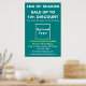 Poster that you can use as marketing material for your business to attract more customers every end of season. Customisable poster with end of season sale, your business name and other information. Customise it and use it to convince more customers to buy your products or clients to like your services this end of season. Design colours and shape are white and yellow-green texts on teal green background and portrait format rectangle shape. Contents are end of season, sale, percent discount that you will offer, sale dates, your business name, logo, address, phone number, e-mail and website or your social media page. Please check the appearance after uploading logo and typing texts. If the appearance is pleasing to you, you can place your order now. If you need to resize and move the logo and texts to fit on this poster or on other appropriate size, shape and style that you will choose, please change in the design tool. You can also make other changes in the design tool according to the appearance of this poster that you prefer such as changing the background colour, font colour and font style. Wishing you more sales this end of season and all the seasons.