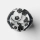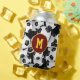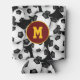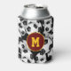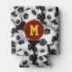 This personalised soccer themed canned beverage cooler features a pattern of seemingly endless, randomly arranged soccer balls on a black background - customise the monogram on a maroon and gold circle pendant - customise the colours of the circle pendant & monogram to match a favourite soccer team's colours - by katz_d_zynes