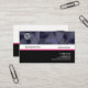 A simple design featuring an elegant grey geometric design as a background cover with an embedded white globe at the top left corner. The card is demarcated into three sections. Below the geometric design is your name and job title in the white column. Underneath it is a pink line to accentuate the design. Your contact details rest in the dark grey rectangle at the bottom.