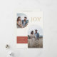 These 5" x 7" flat greeting cards feature placeholders for three photos, two names, year and a message. The front has two arched photos, one vertical and one, horizontal. The greeting is "Joy," in gold letters. The background is ivory with a adobe brick red box encasing the couple's names. The back has one vertical photo. The customisable message reads, "We are thrilled to announce that we became engaged, and we both wish you peace and joy over the holidays and in the coming year."
