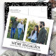 Perfect winter engagement announcement features two couple's photos on the postcard front. A snowflake pattern frames the back. A pre-printed return address and message is provided for your convenience.