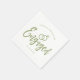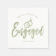 A fun and unique script lettered napkin tailored specifically to you an engagement party. It features the word engaged with wedding rings resting about it. Underneath this and above it are the names of the bride and groom and the engagement date.