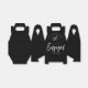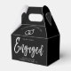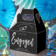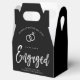 A fun and unique white script-lettered paper gable box tailored specifically to your future engagement party. It features the word "engaged" with wedding rings resting over it. Surrounding this are the names of the bride and groom and the engagement date. Towards the bottom of the front of the box is a spot for your unique message to your guests.