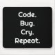 Perfect for programmers and tech enthusiasts 💻 this sleek mouse pad features "Code. Bug. Cry. Repeat." in bold white on a stylish black background ✨ Simple, modern, and relatable, a design that captures every coding session 🎁 Ideal gift for anyone who loves programming, debugging, or all things tech 🖱️ Comfortable & durable, smooth surface for precise mouse movements built for daily use 💡 A witty and thoughtful gift for developers, engineers, and tech lovers alike.