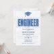A background of engineering drafting designs, with the same engineer drafting paper effect over the bold letters spelling the word ENGINEER in blue, as well as a graduation cap with the same drafting and graph paper design effect, decorate this modern, elegant and classy graduation party or celebration invitation for a newly minted engineer. The generic design fits many types of engineering degrees, from mechanical engineer, to electrical engineer, computer engineer, chemical engineer and more. Customise every line of text, to include the graduation ceremony and afterwards party, or only the party, an open-house celebration... etc.