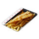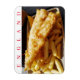 A close up photograph of Fish and Chips printed on a souvenir fridge magnet.